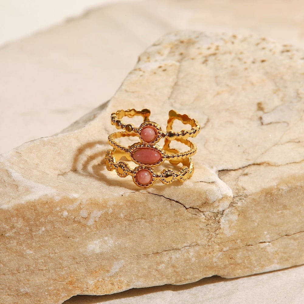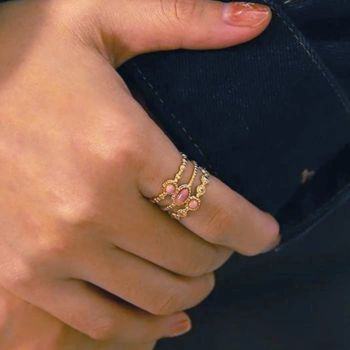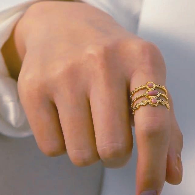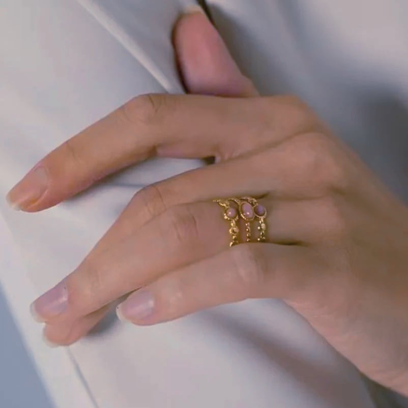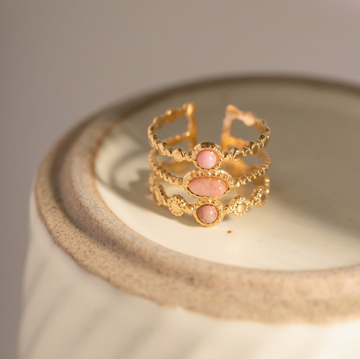 淡いピンクのストーンとゴールドの煌めきが織りなす、エレガントなレイヤードリング。