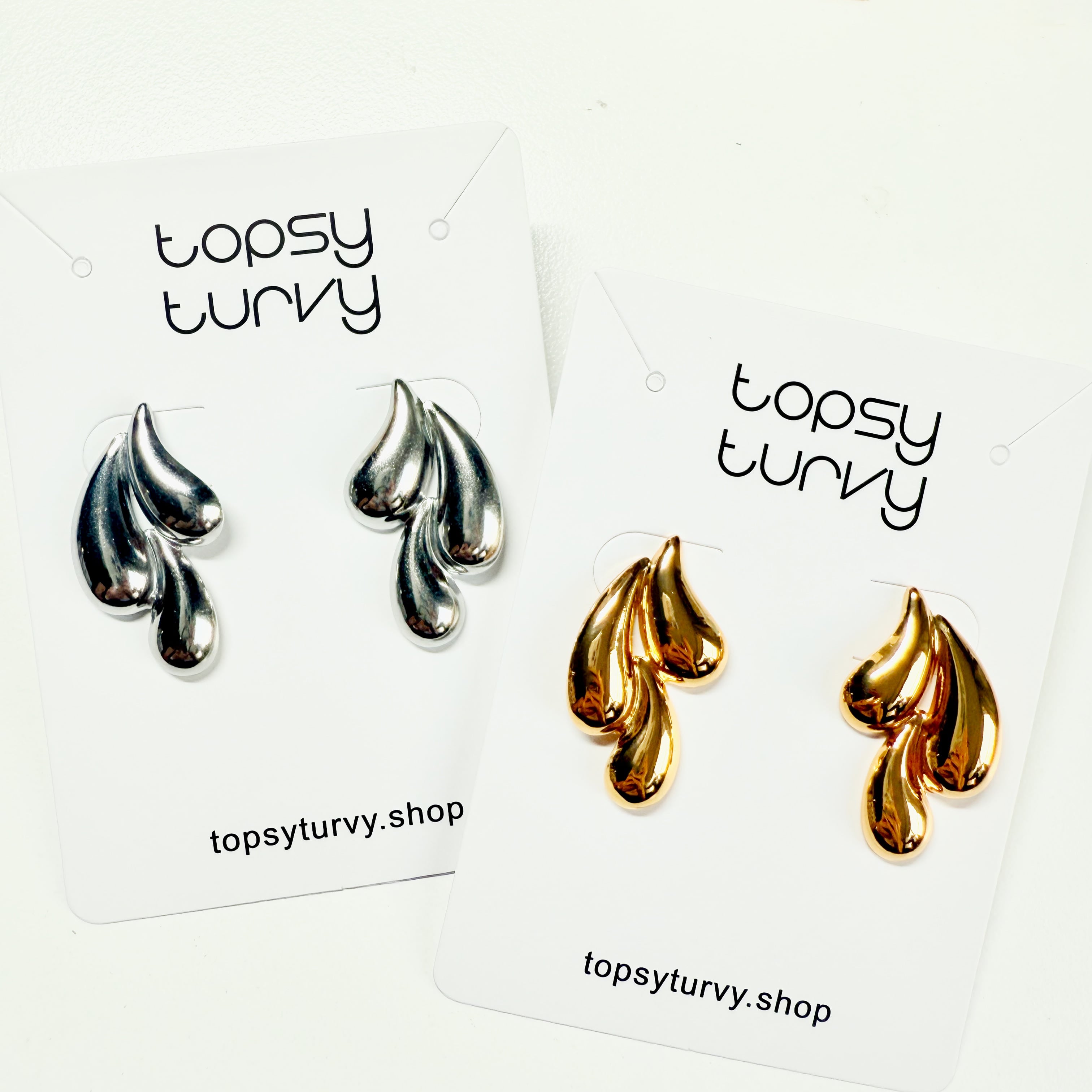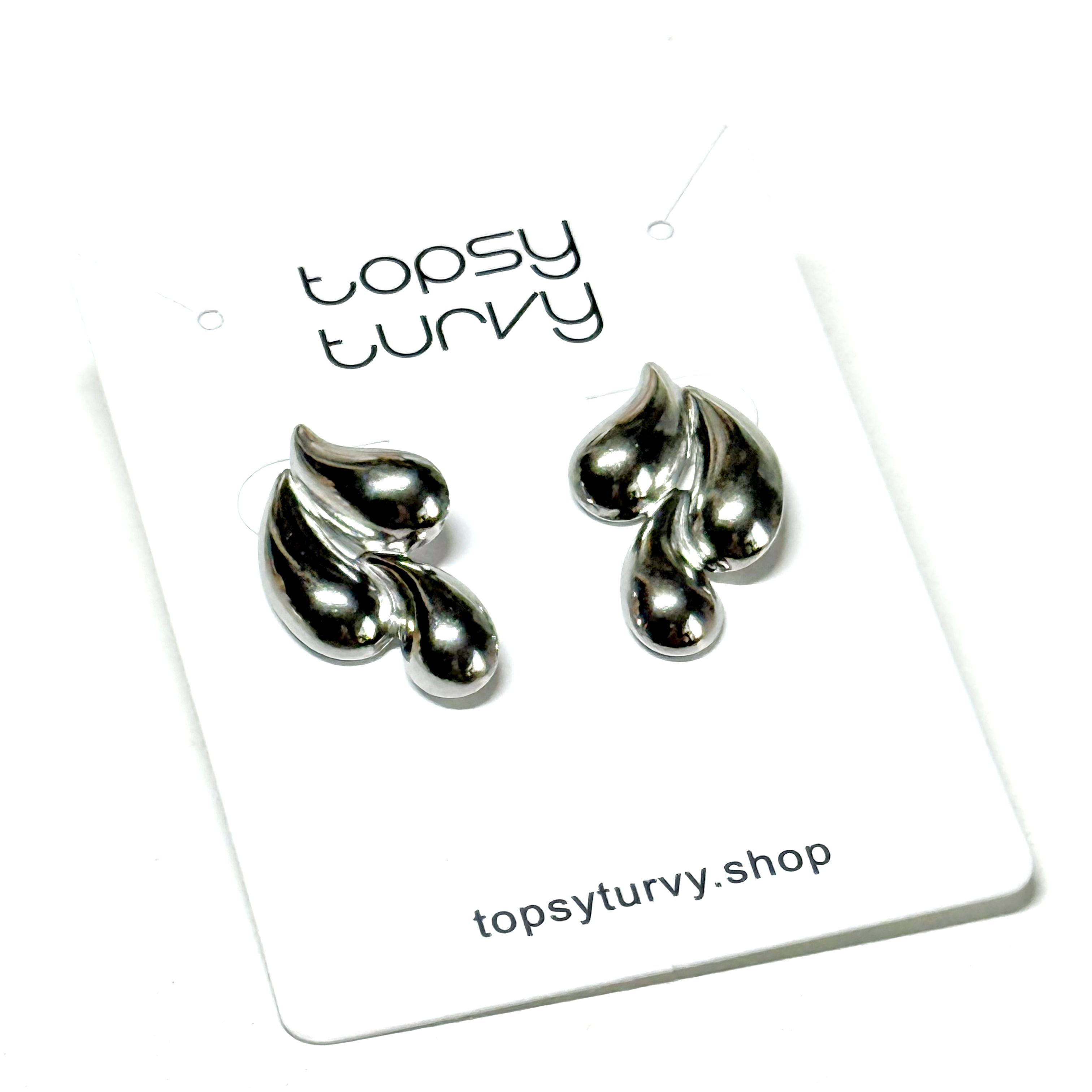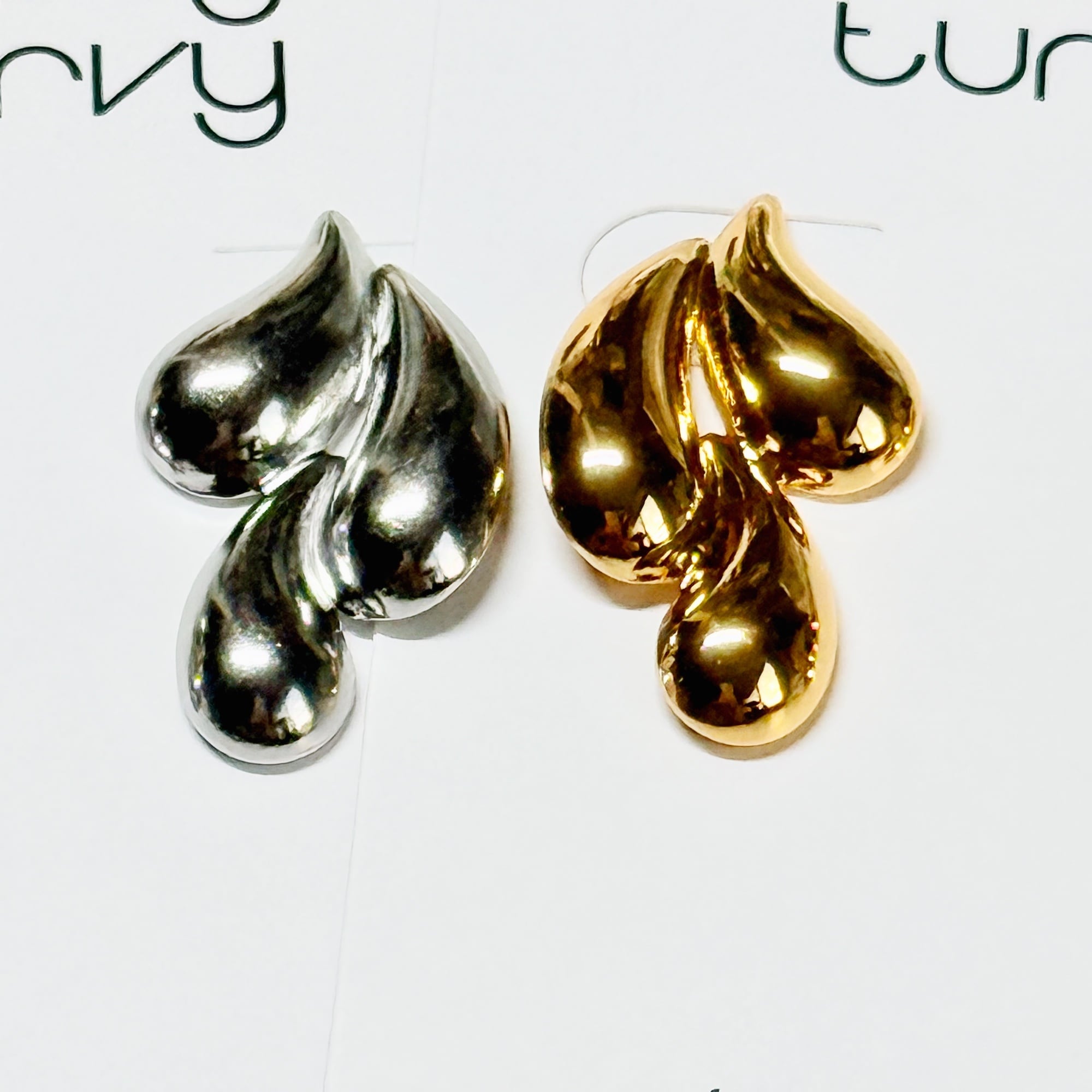 ぽってりとしたドロップ型のフォルムが、耳元で光を集める立体感のあるメタルピアス。