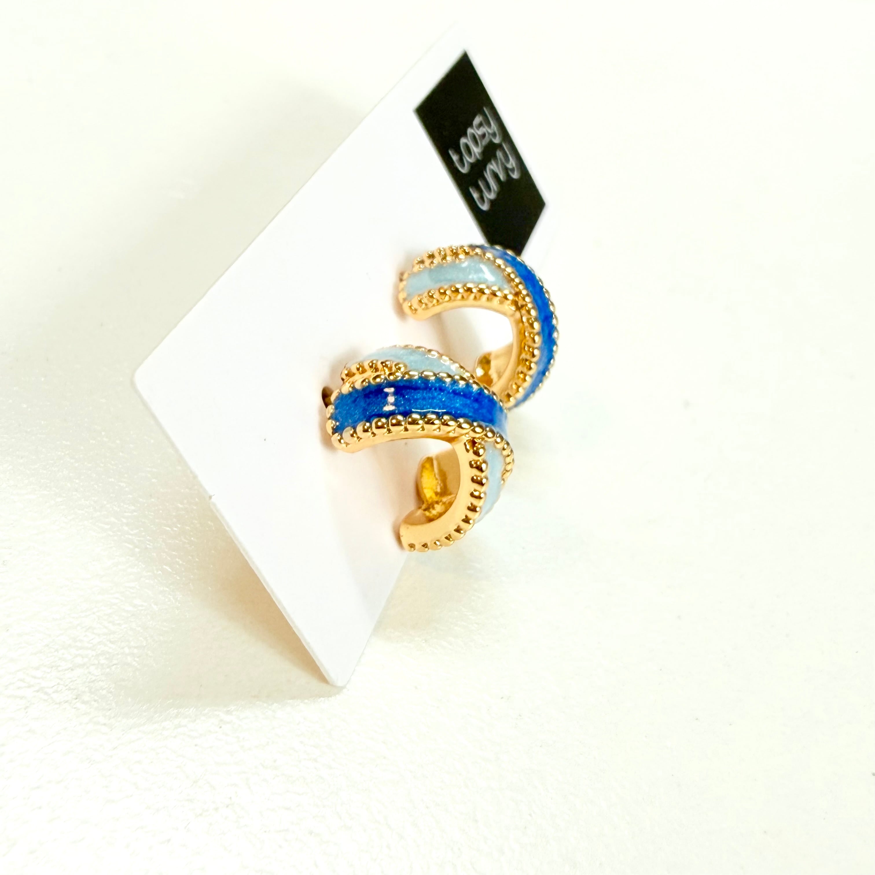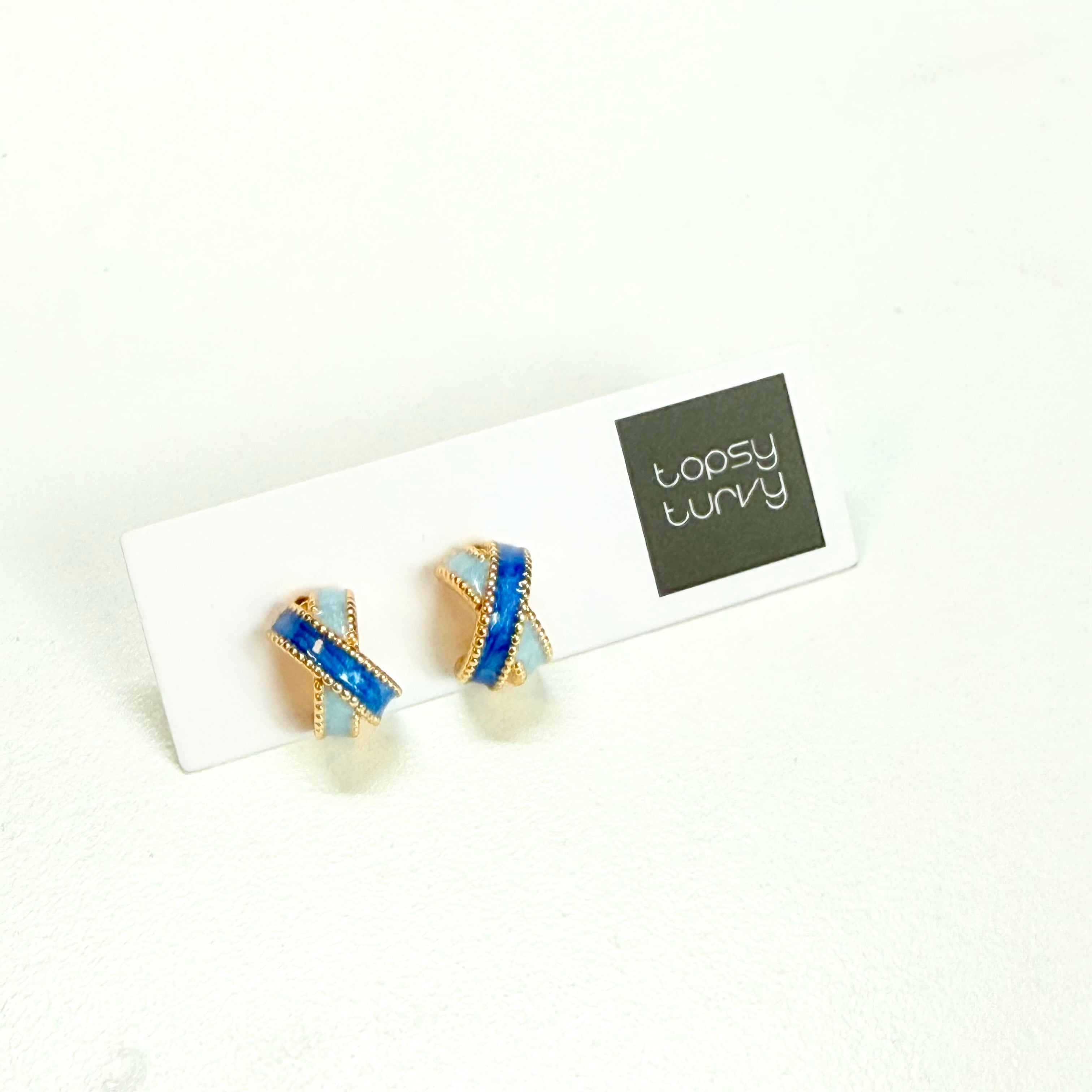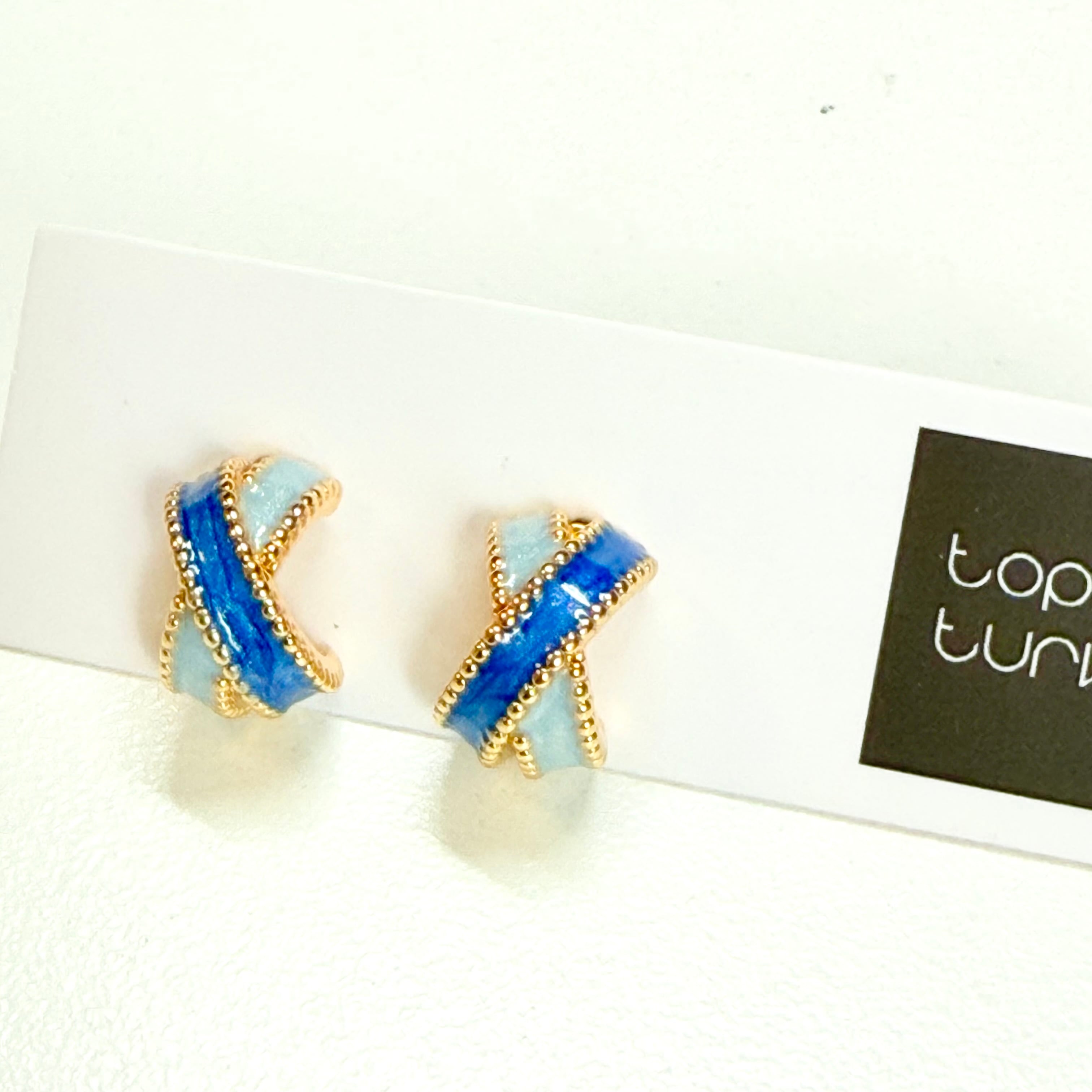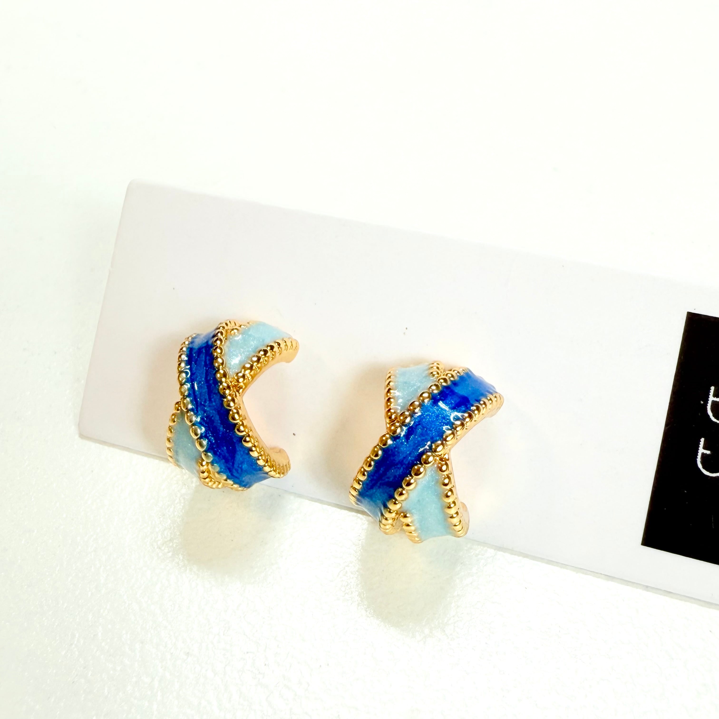 トーンの違うブルーがリボンのように重なり合い、耳元にさりげない品をプラス。
