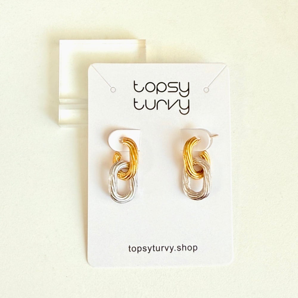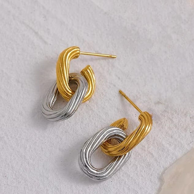 ゴールドとシルバーのツイストパーツを組み合わせた、存在感たっぷりの2WAYピアス。