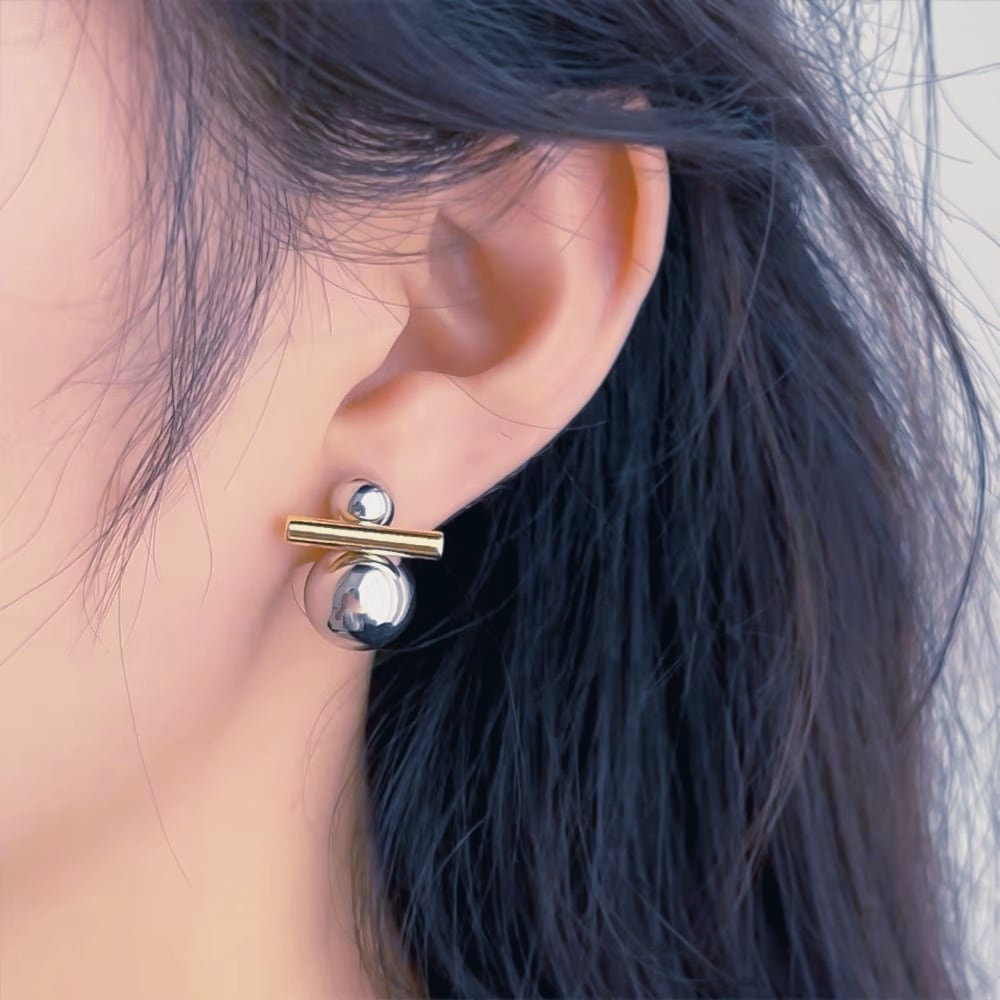 ミニマルなアートピースのような、バーと球体のイヤリング。