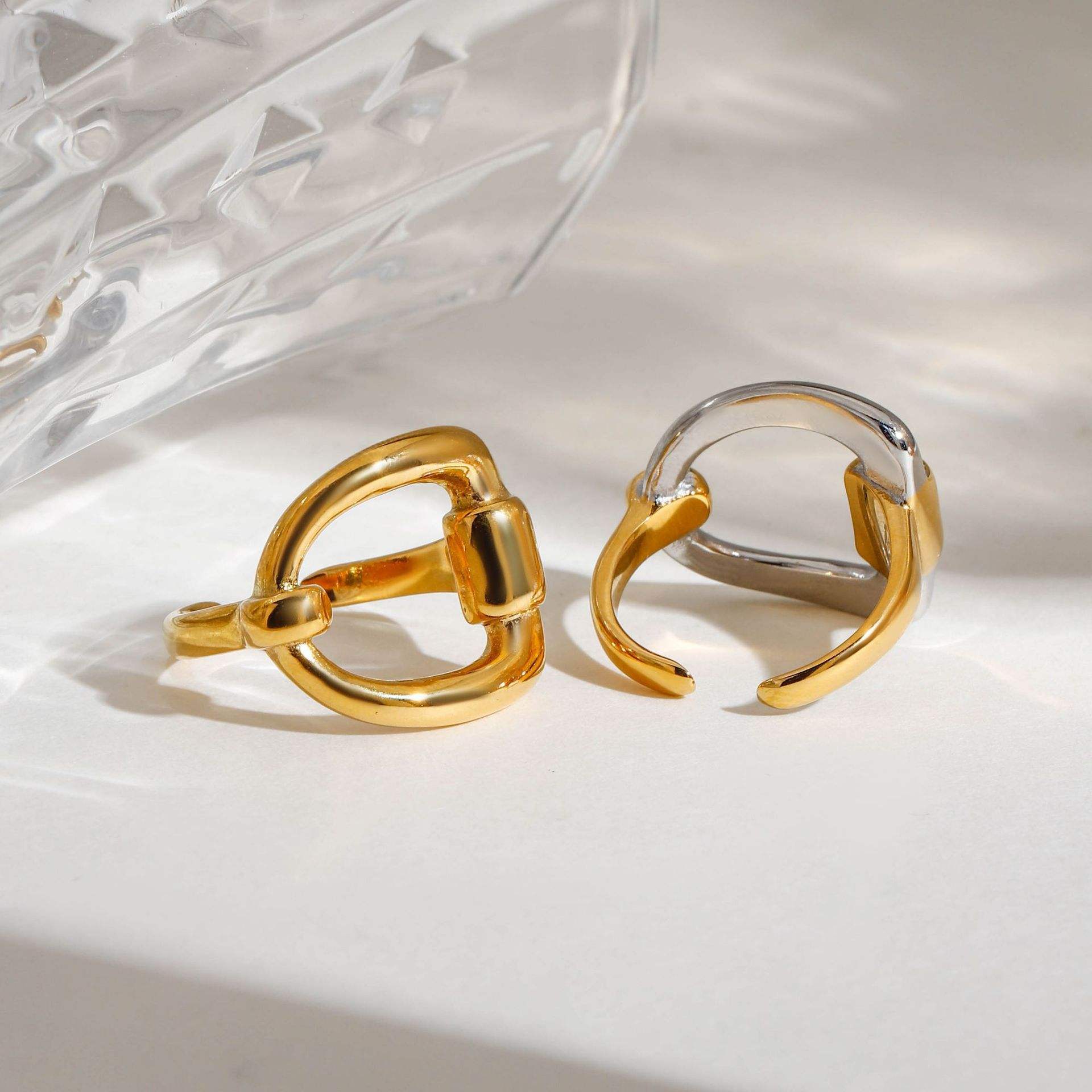 ベルトのバックルを思わせる、クラシックなフォルムが印象的なリング。