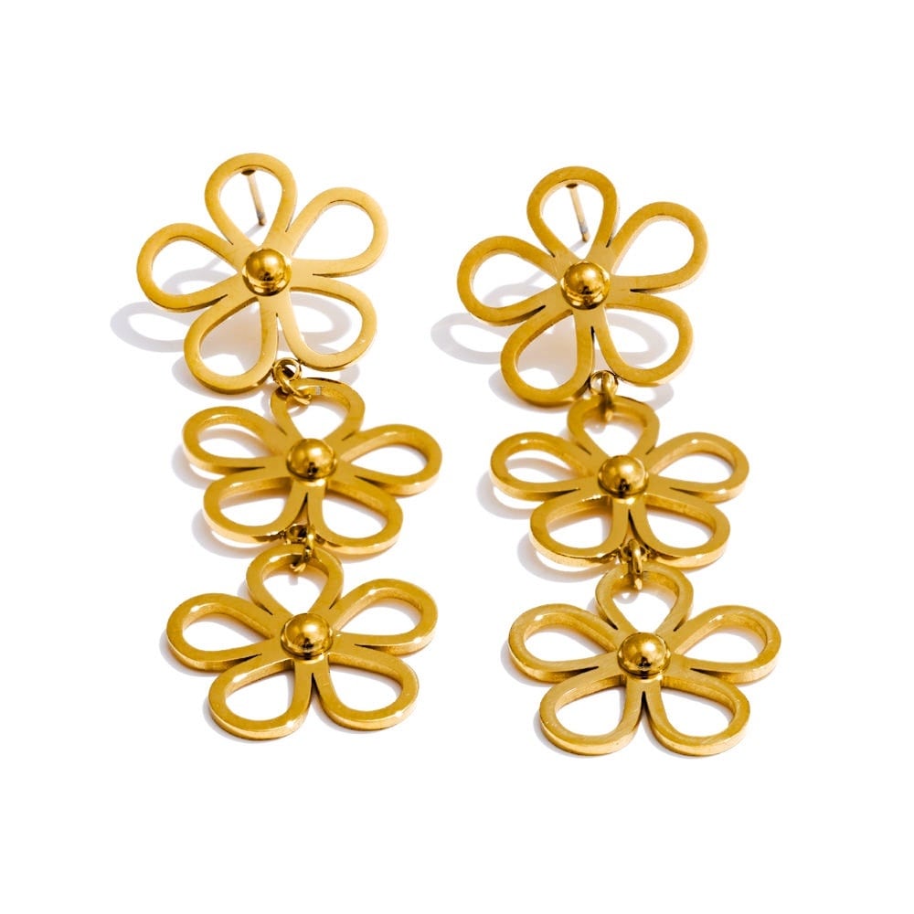 ミニマルなラインで描かれたデイジーが、3連でつながる洗練のロングピアス。