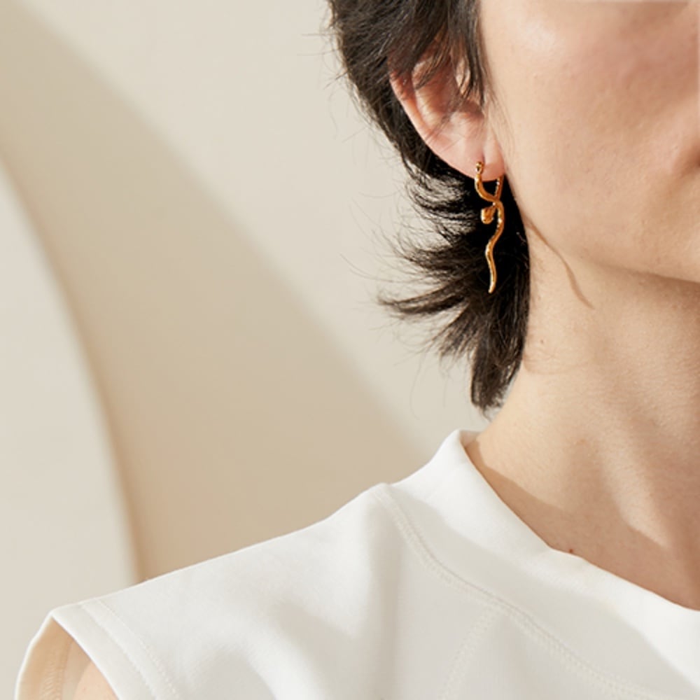 優美にうねるゴールドのボディと、しなやかなフォルムが魅力のスネークフープピアス。