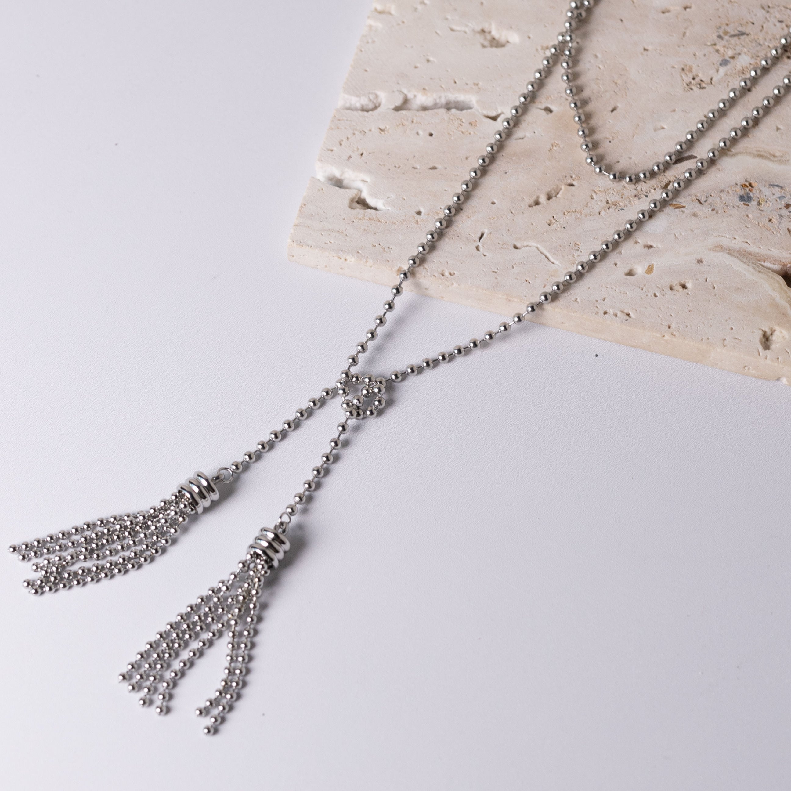 チェーンからタッセルまですべてがボールチェーンで構成された、スタイリッシュなデザインです。