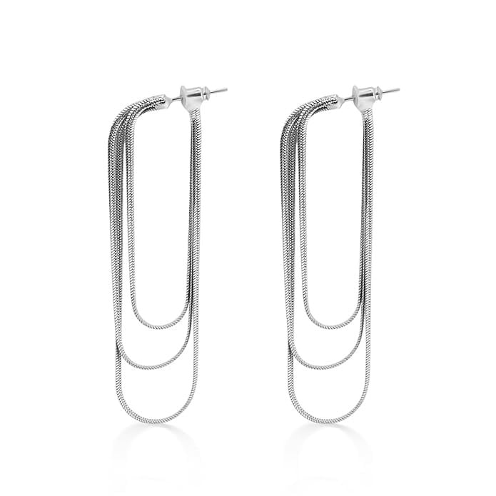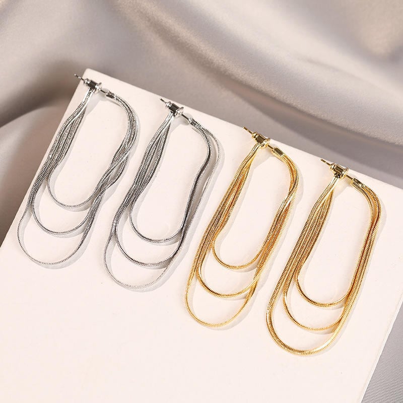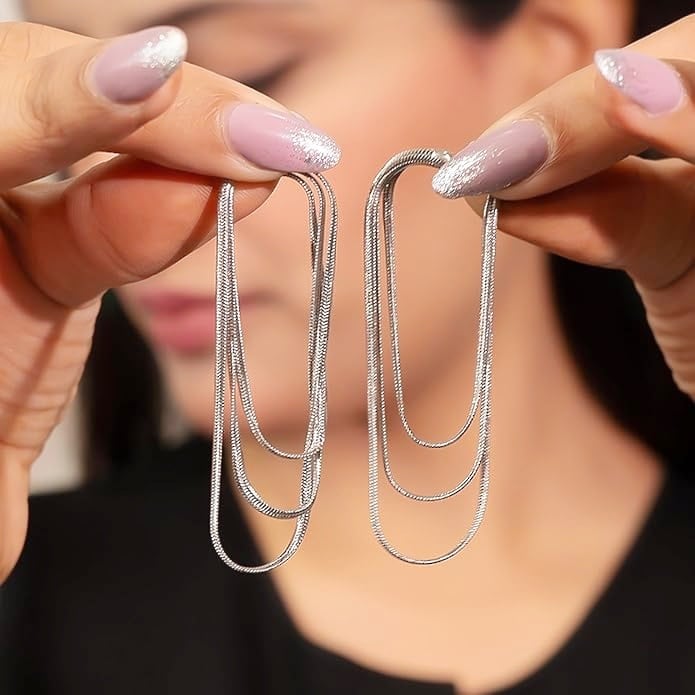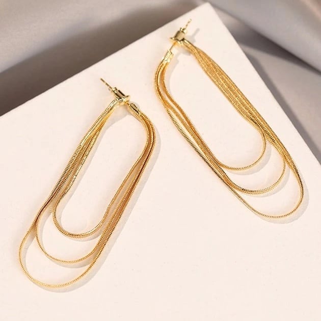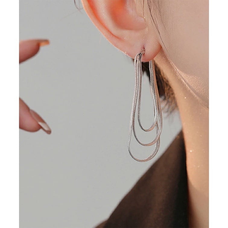 しなやかに揺れる3本のチェーンが、ゆらめきながら耳元に沿うロングピアス。