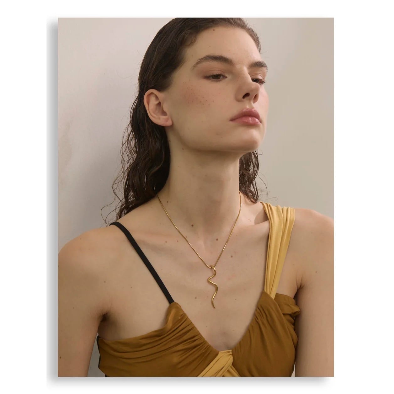 メタルモチーフが流れるようなカーブを描く、都会的でモダンなネックレス。