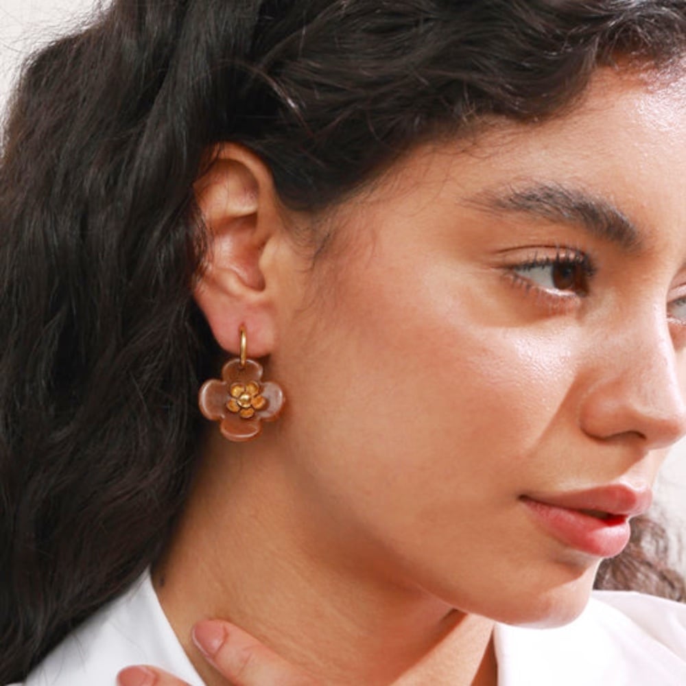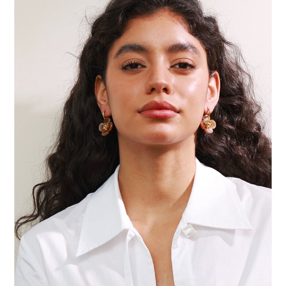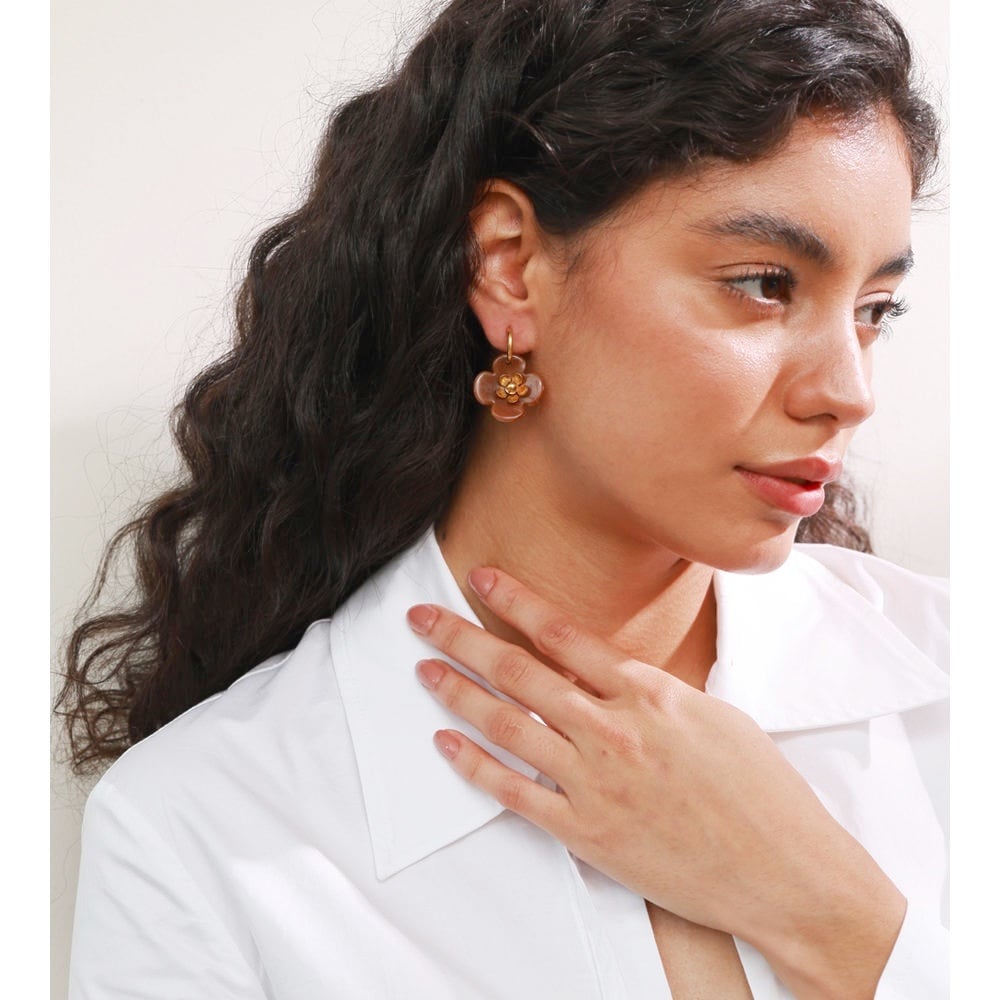 つやめく質感と、中心のお花の二層デザインが、耳元に華やぎを添えてくれます。