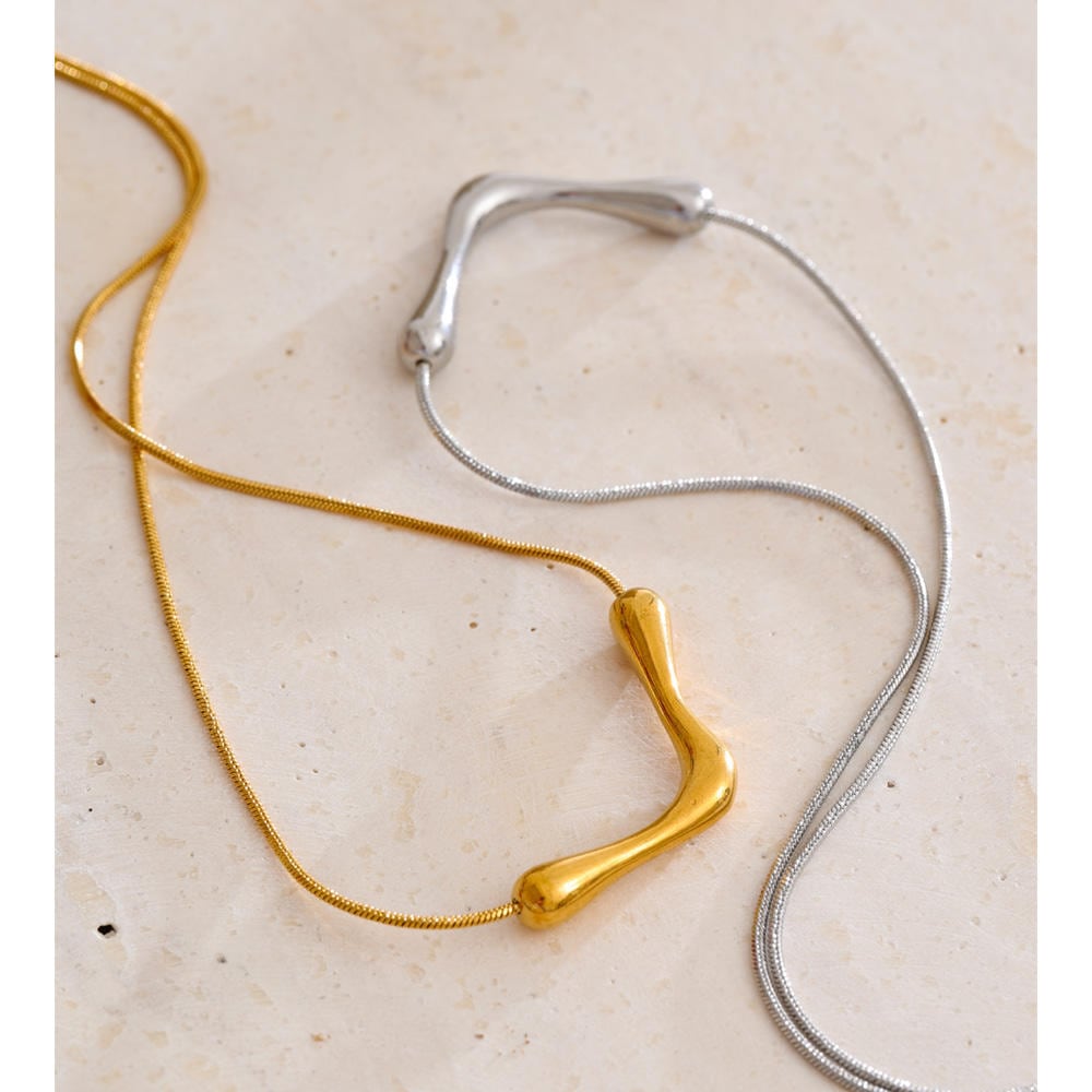 シャープさと柔らかさをあわせ持つ、ゆがんだニュアンスカーブが印象的なメタルネックレス。