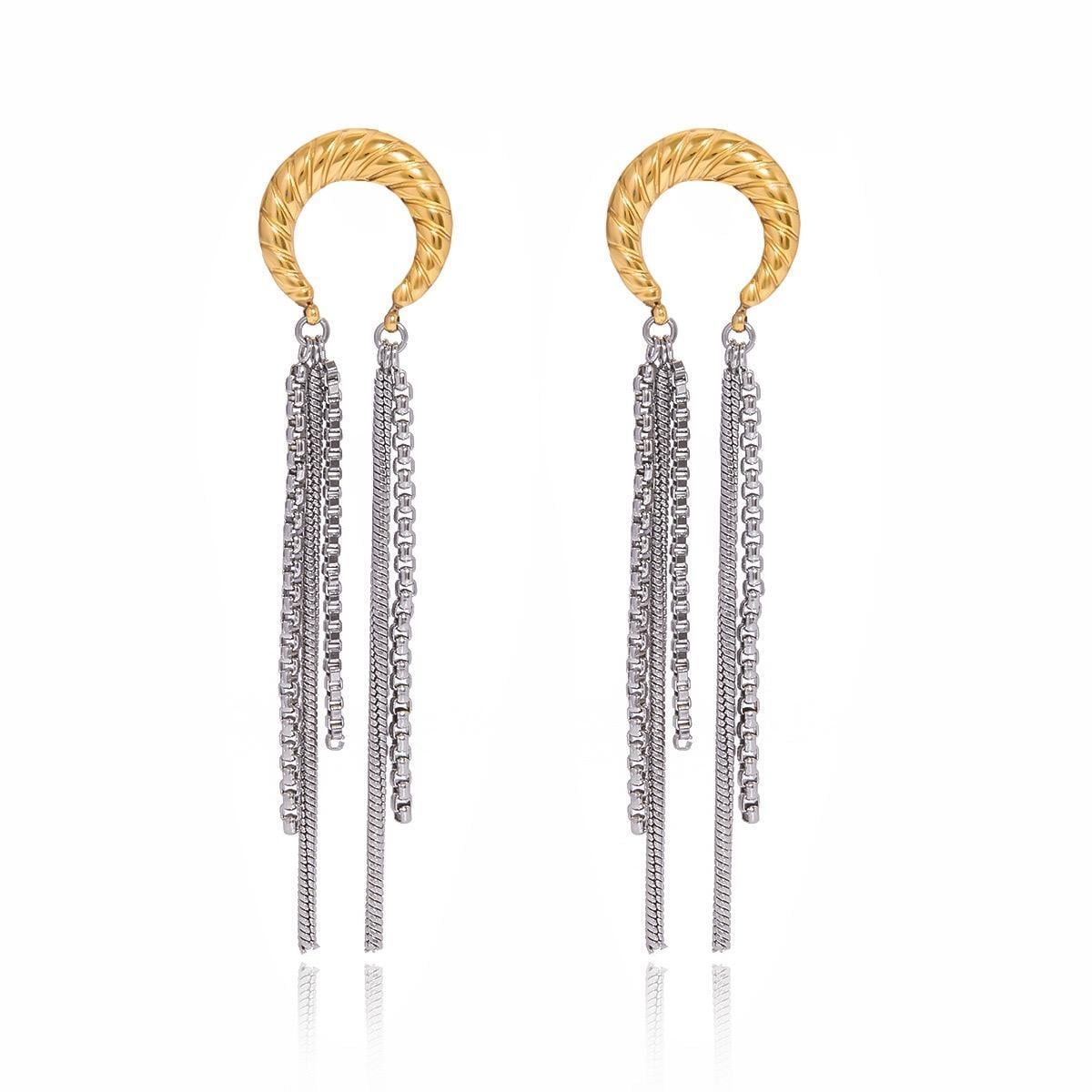 立体感のあるツイストフープに、異なるチェーンを合わせたミックスメタルピアス。