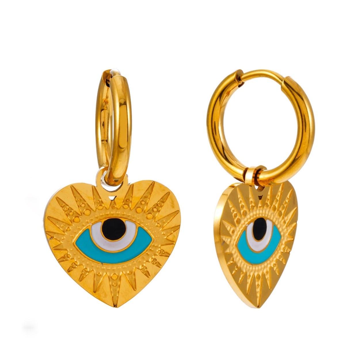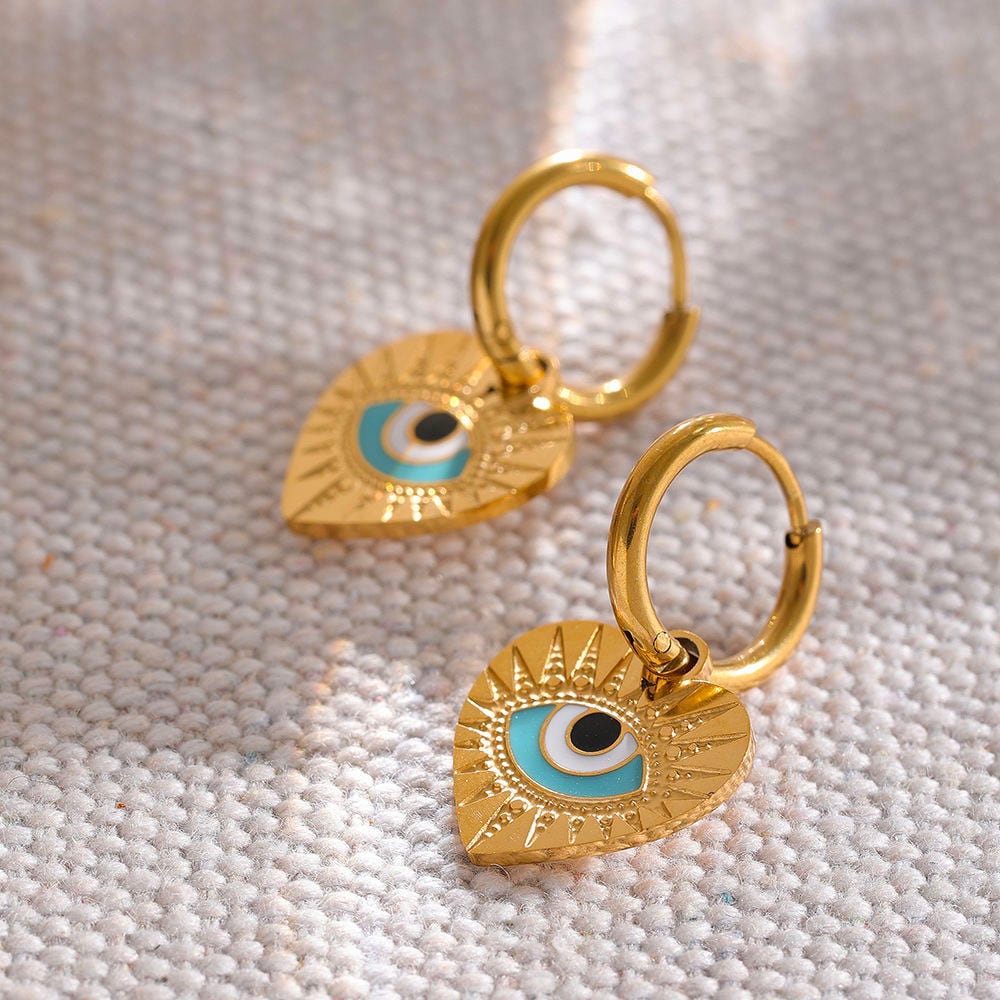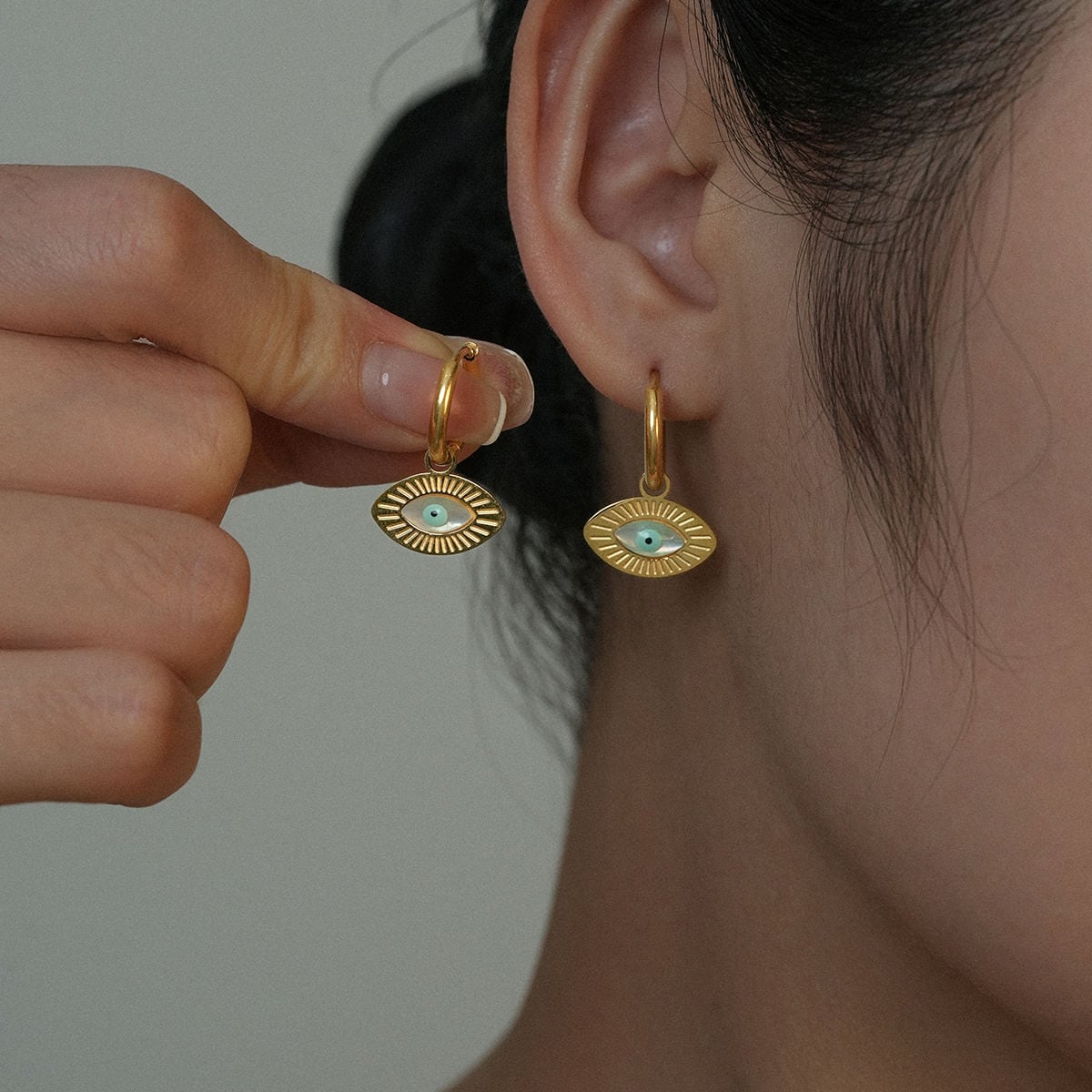 キュートに揺れるEvil Eyeが印象的な、ゴールドフープピアス。