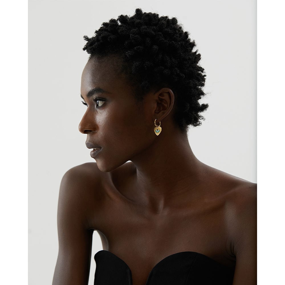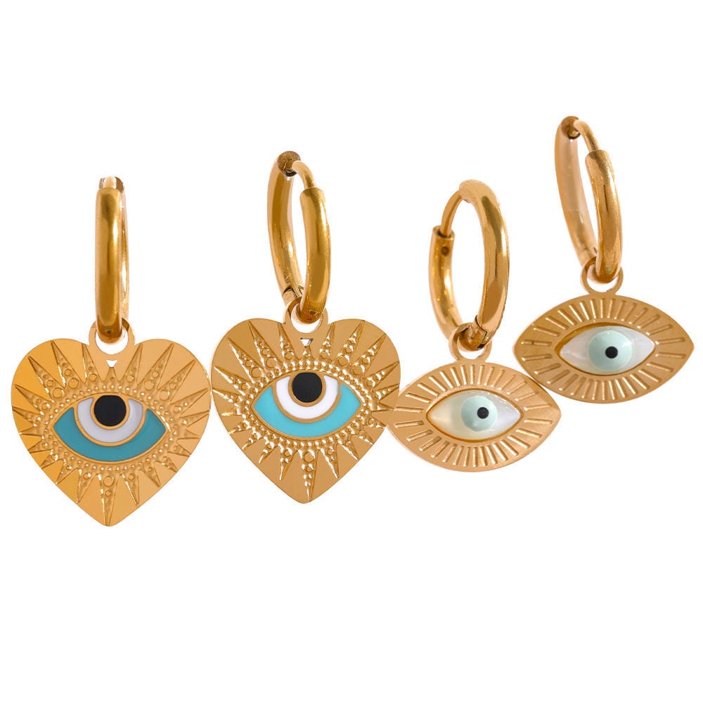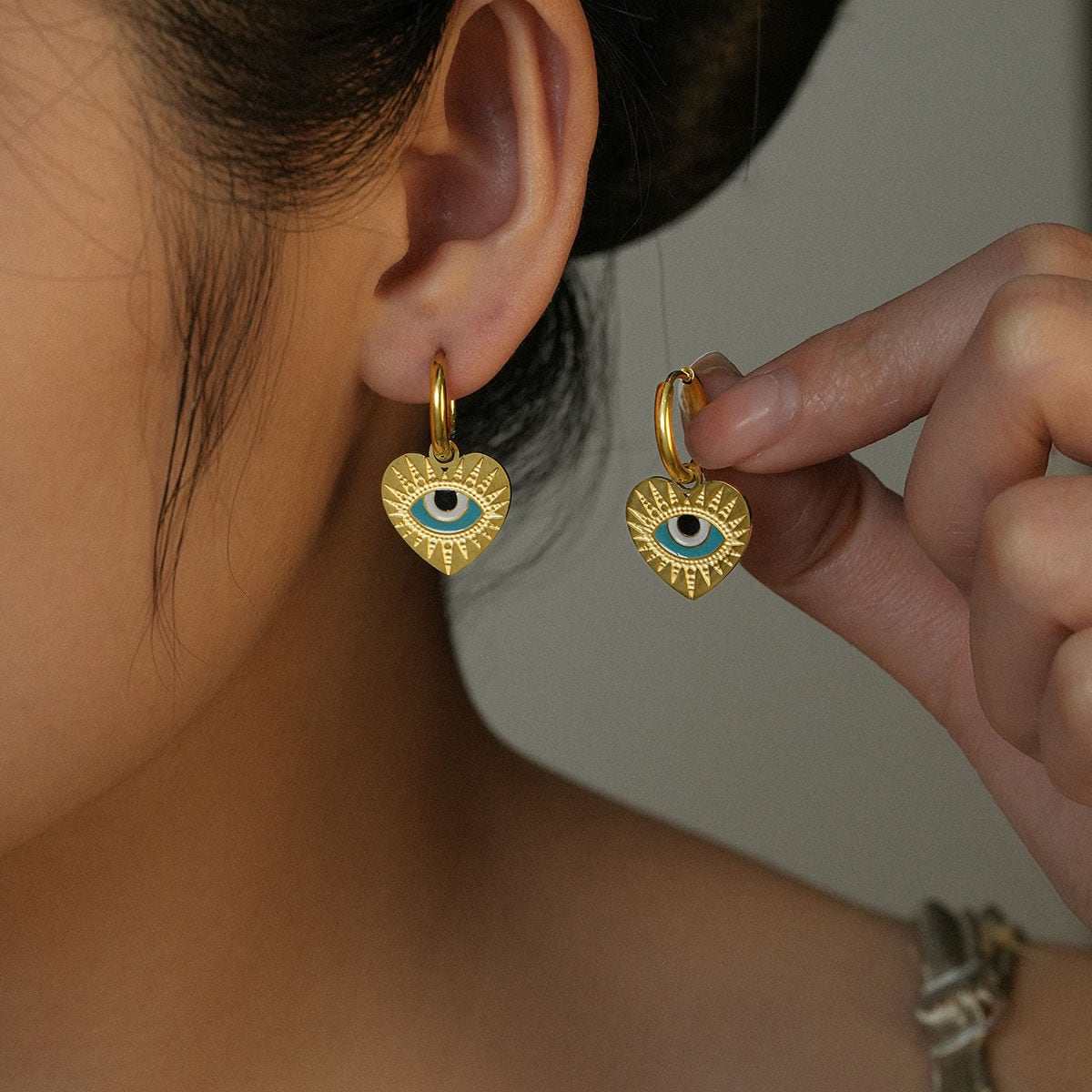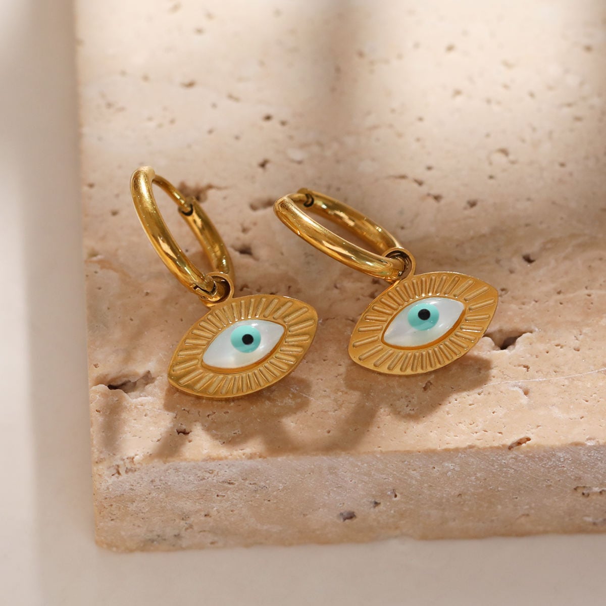キュートに揺れるEvil Eyeが印象的な、ゴールドフープピアス。