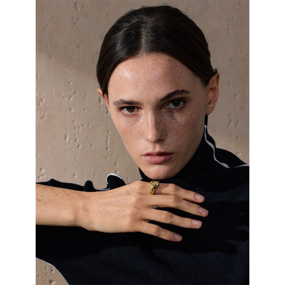 やわらかく溶けたようなフォルムに、美しいストーンが印象的なリング。
