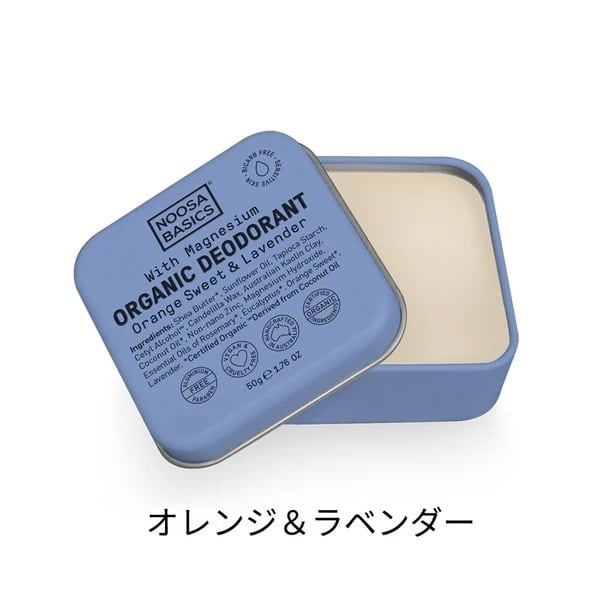 シア脂・ヒマワリ種子油・タピオカデンプン・セタノール・キャンデリラロウ・カオリン・ヤシ油・酸化亜鉛・水酸化Mg・ローズマリー葉油・ユーカリ葉油・オレンジ果皮油・ラベンダー油